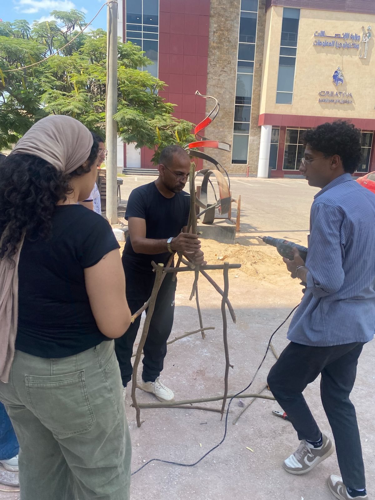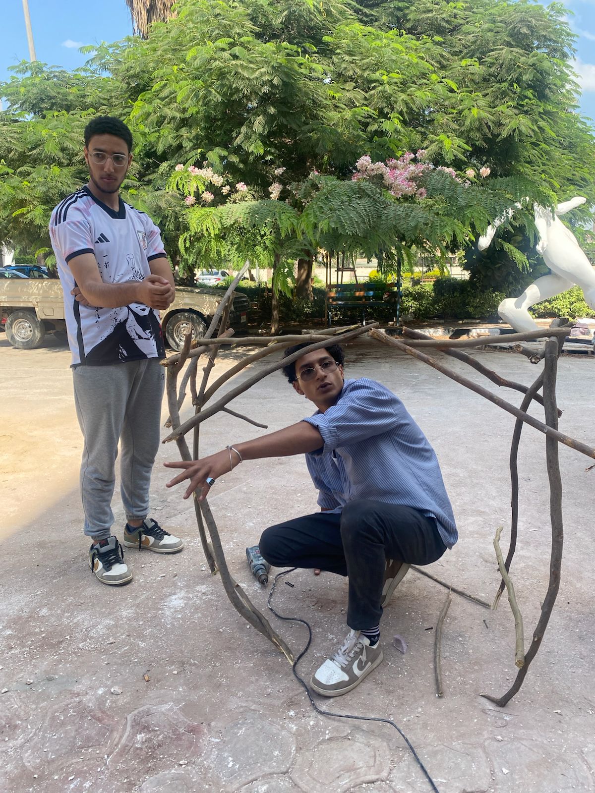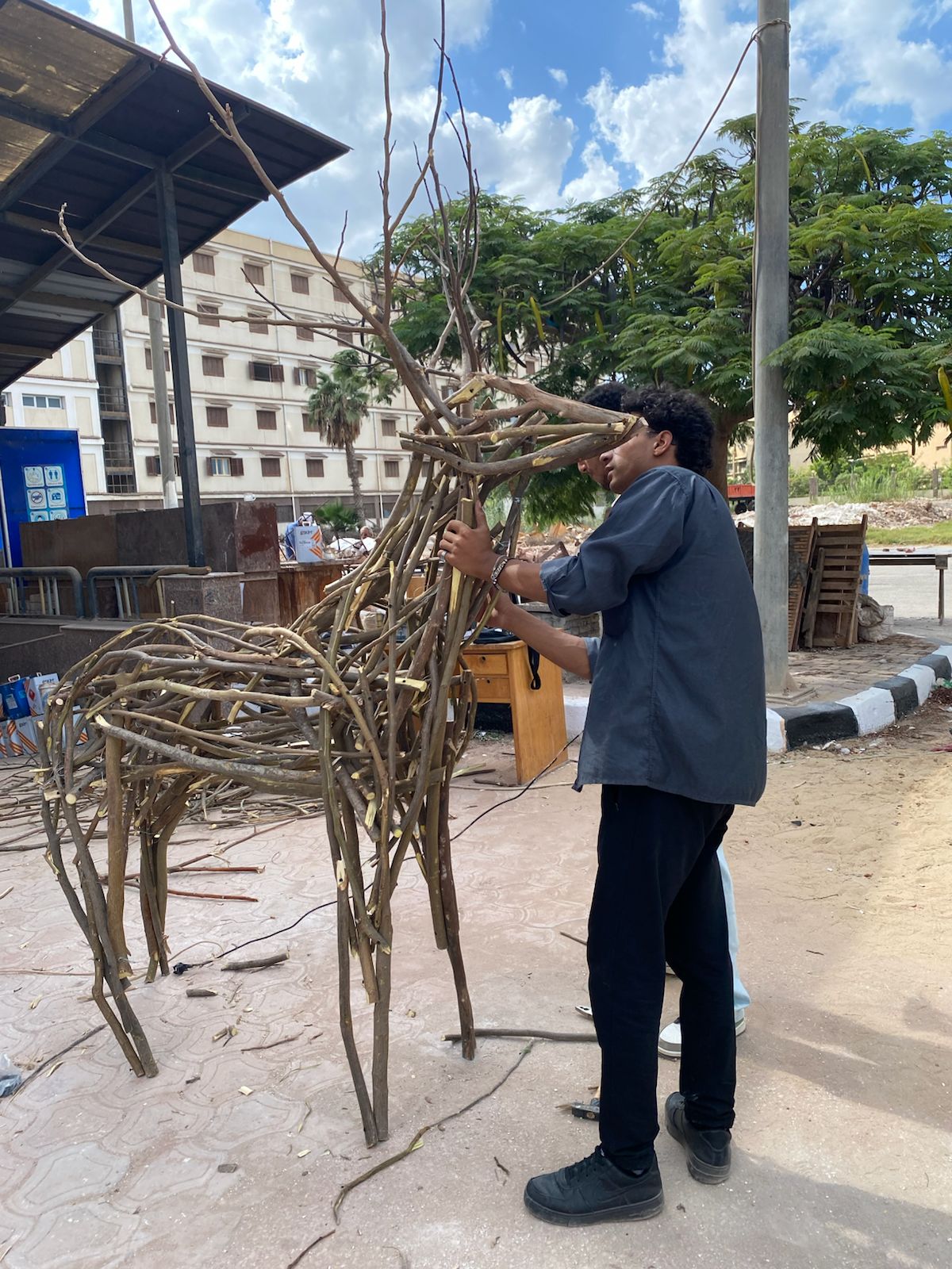وقد استخدمت في هذا العمل فروع وأخشاب الأشجار التي تم إعادة تدويرها وتوظيفها فنياً لإنتاج عمل نحتي يعكس هوية الكلية وقيمها الفنية والبيئية.