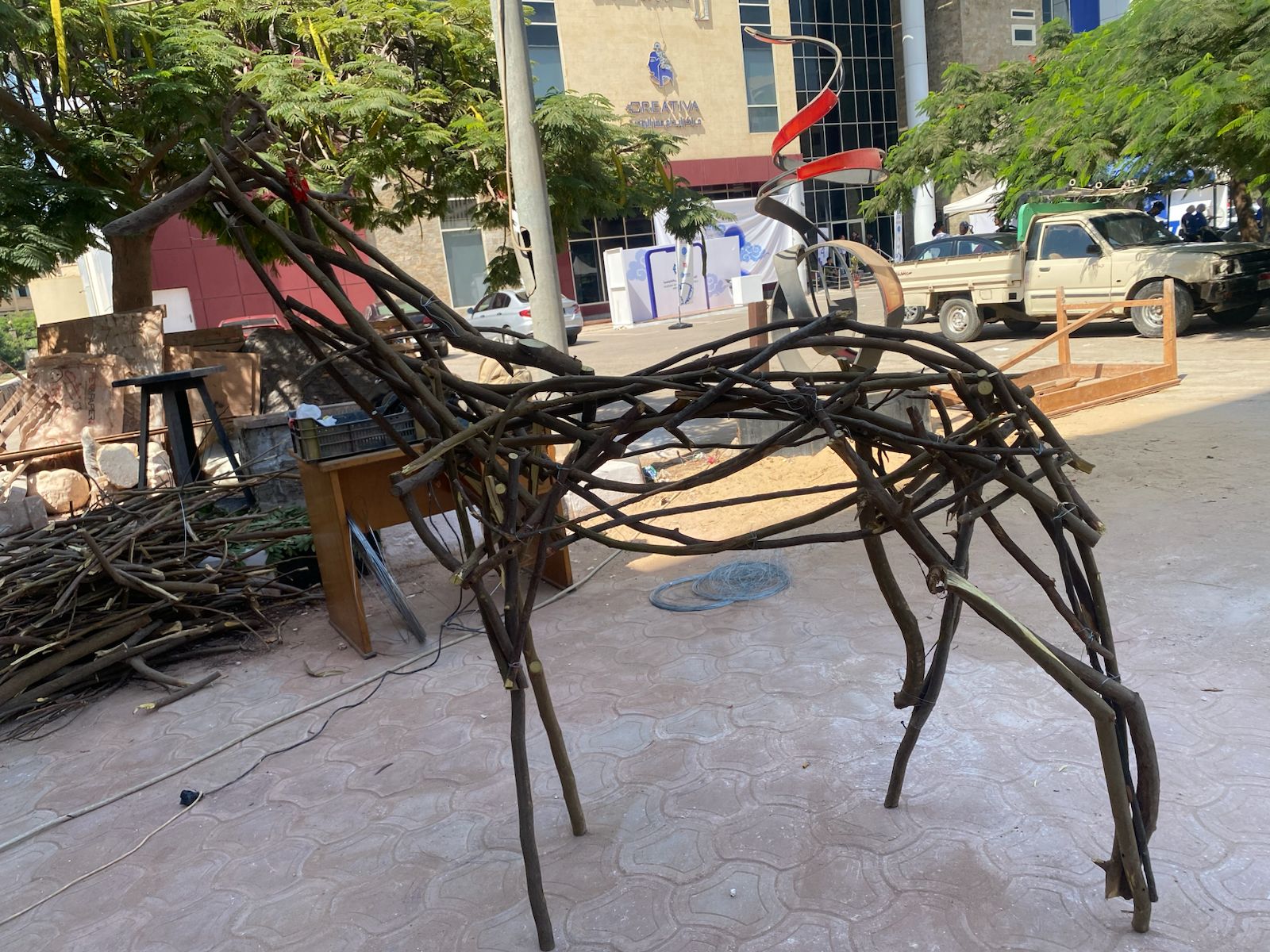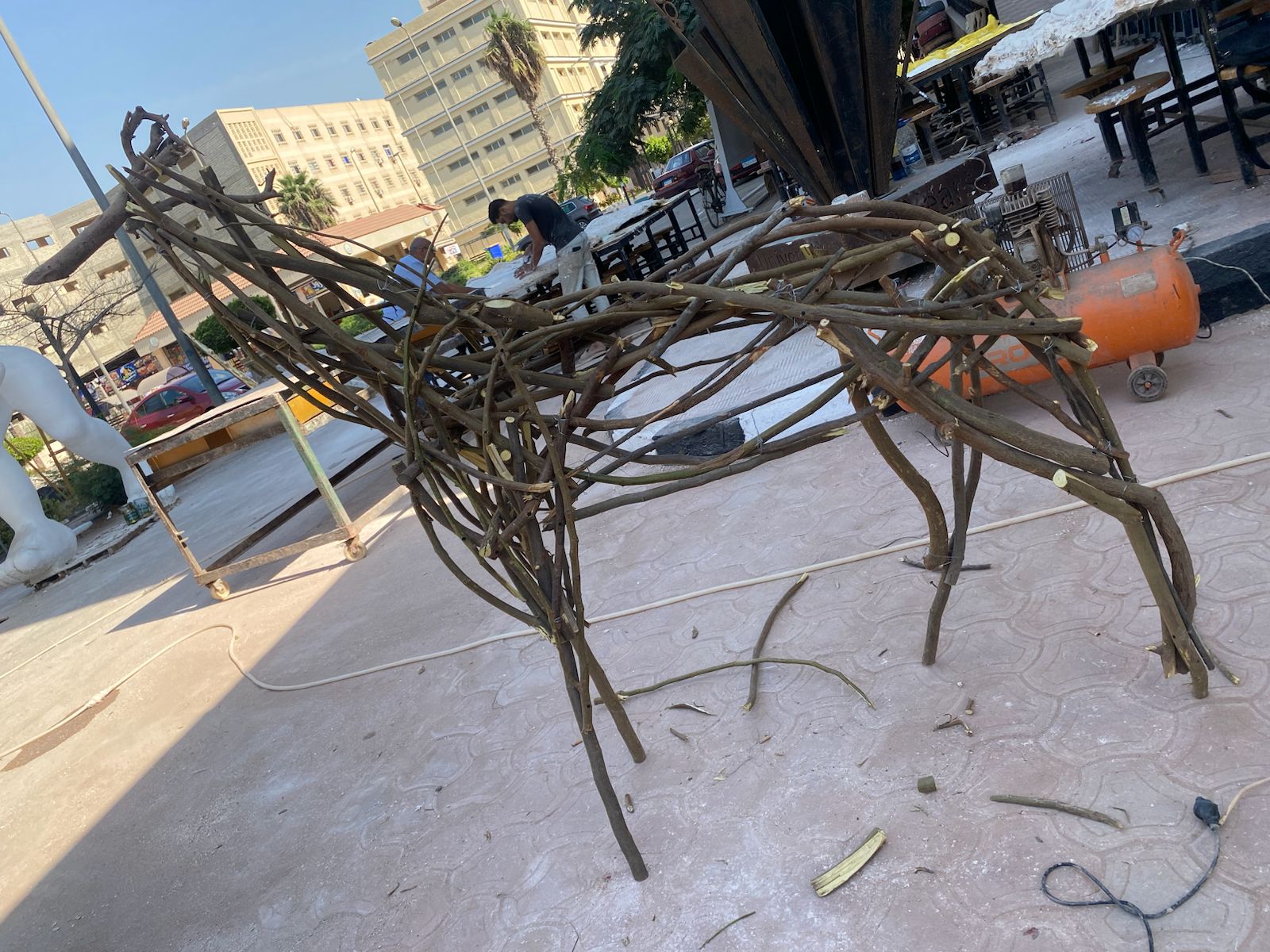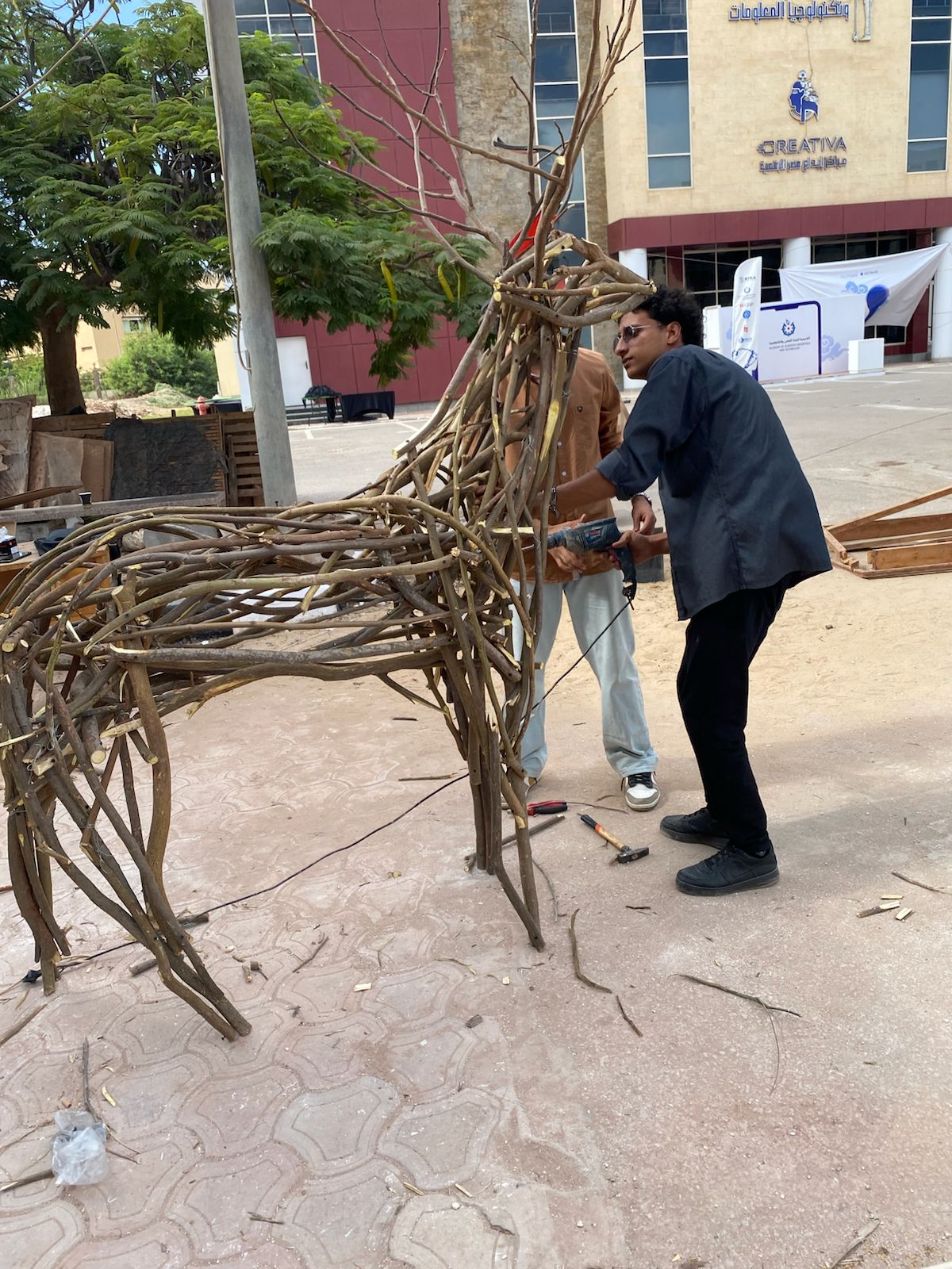 وقد استخدمت في هذا العمل فروع وأخشاب الأشجار التي تم إعادة تدويرها وتوظيفها فنياً لإنتاج عمل نحتي يعكس هوية الكلية وقيمها الفنية والبيئية.