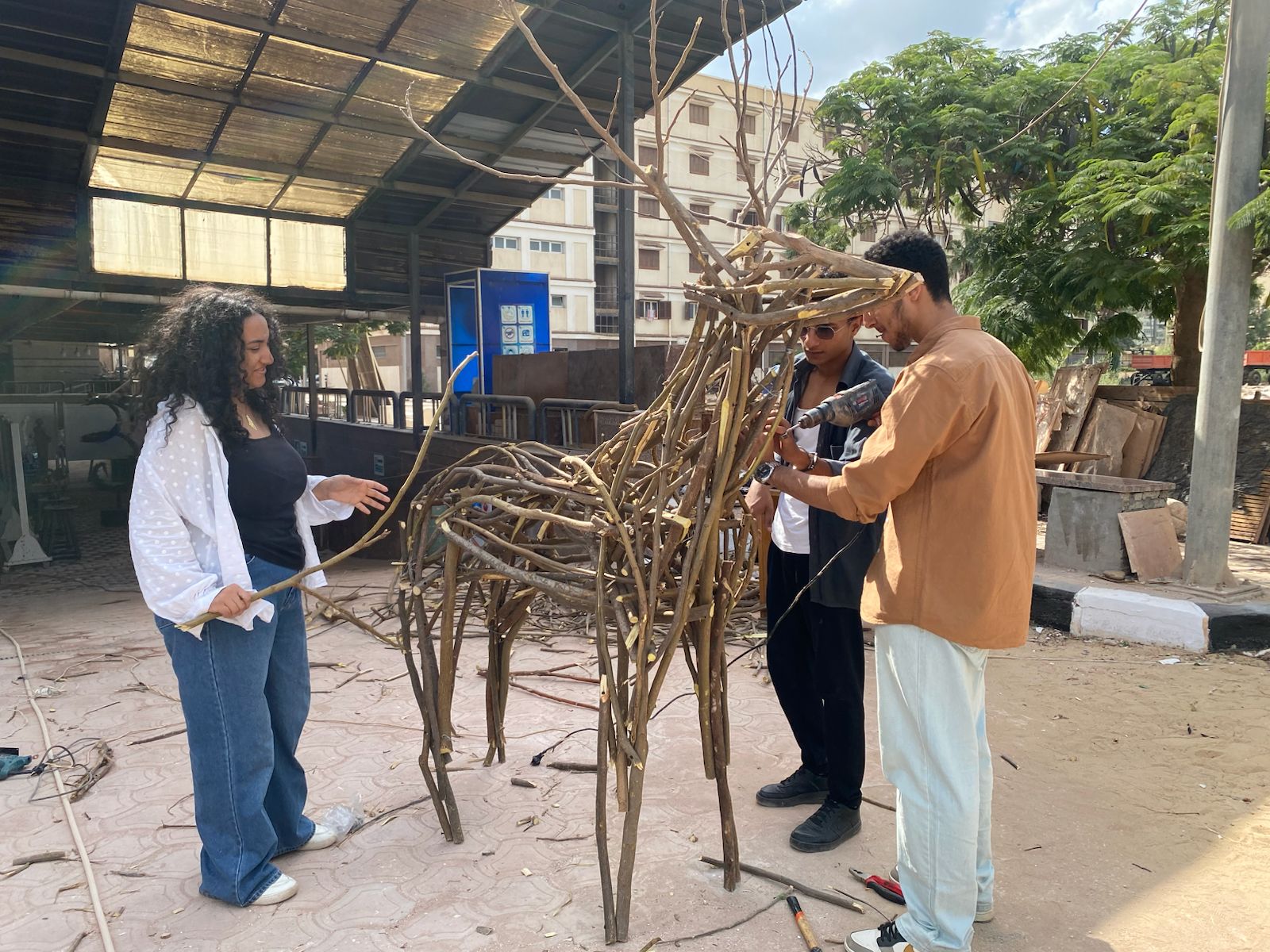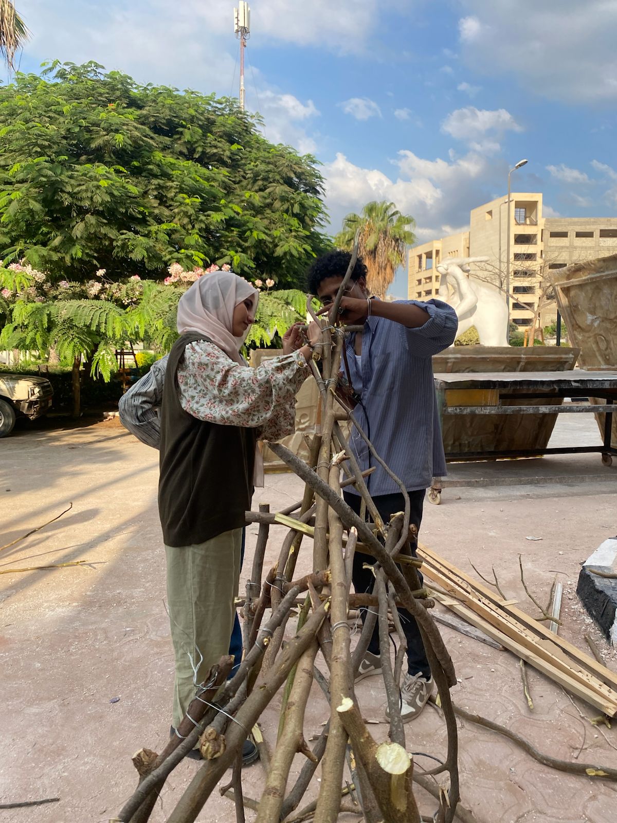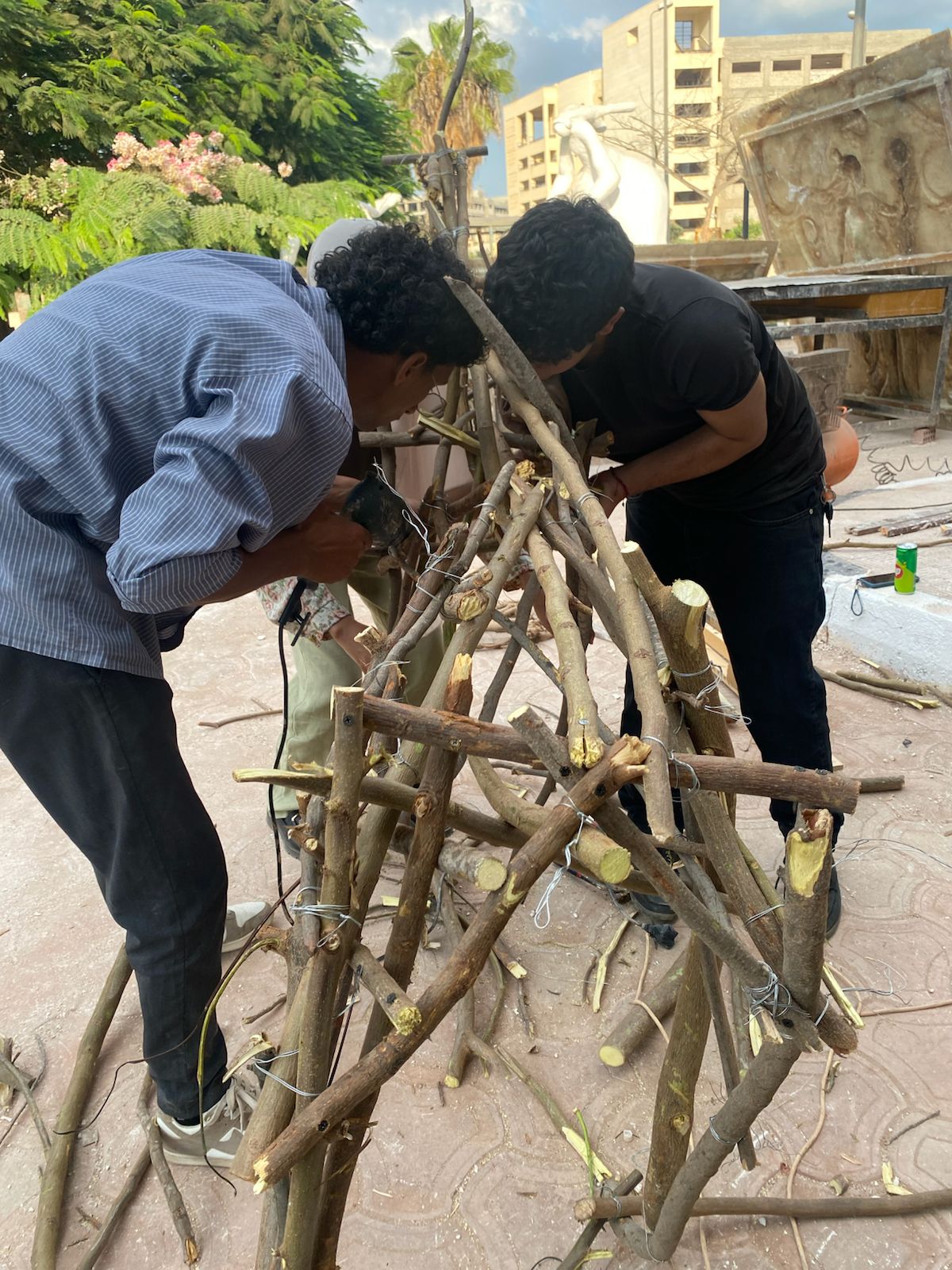 وقد تم تنفيذ العمل النحتي من خلال فريق متكامل من: اعضاء من الهيئة المعاونة لقسم النحت : م.م/محمد حبيش مدرس مساعد بقسم النحت وم/فرح محمد معيد بقسم النحت وبمشاركة عدد من طلاب قسم النحت القدامي والجدد: