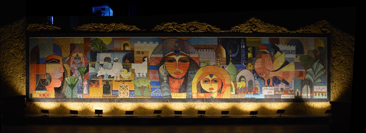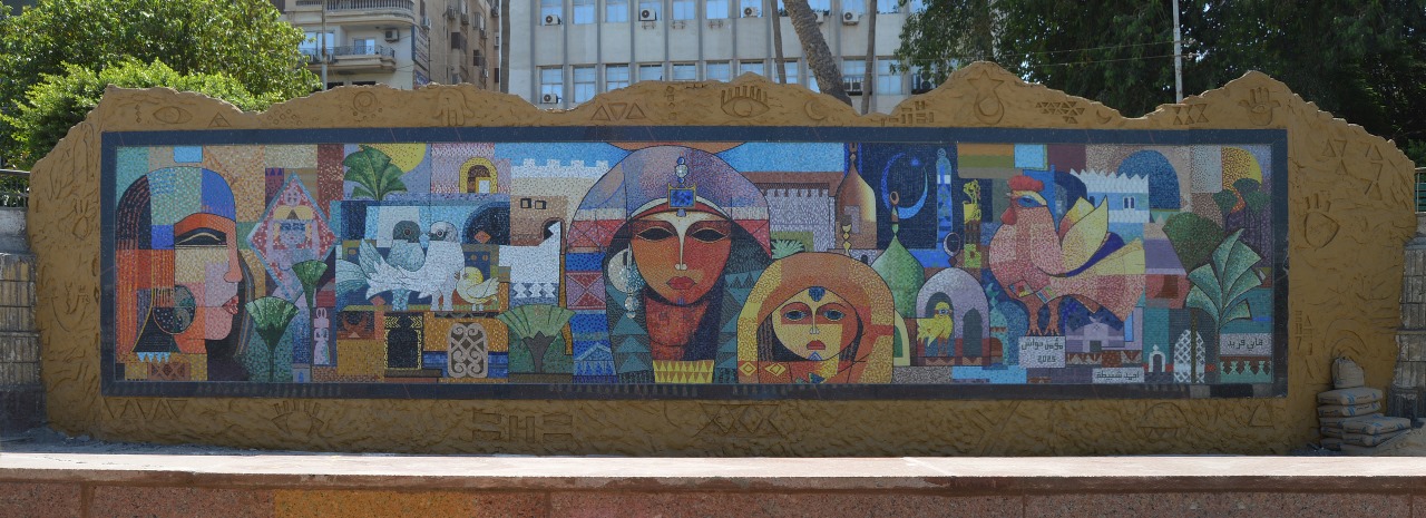 في إطار مشروعات تجميل الميادين بمحافظة الدقهلية تم تكليف أ.م.د.هاني محمد فريد الأستاذ المساعد بقسم الجرافيك من قبل المحافظة بتصميم وتنفيذ جدارية بخامة الموزاييك ويدور موضوعها عن الفنون الشعبية وذلك لوضعها على جدار حديقة عروس النيل بالمشاية السفلية بمدينة المنصورة وقد استلهم الفنان عناصر اللوحة من الثقافة الشعبية المصرية ذات المدلولات المتوارثة عبر الأجيال وأعاد توظيفها في تكوين واحد مترابط بصريا مستخدما خامة الموزاييك الغنية بدرجات الألوان المعبرة عن مفردات العمل الفني